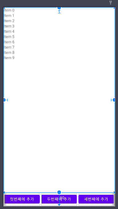 마지막으로 첫 번째에 추가 / 두 번째에 추가 / 세 번째에 추가 / 버튼이 눌렸을 때 각각 해당하는 어답터에 아이템을 추가할 수 있도록 구성하였습니다.