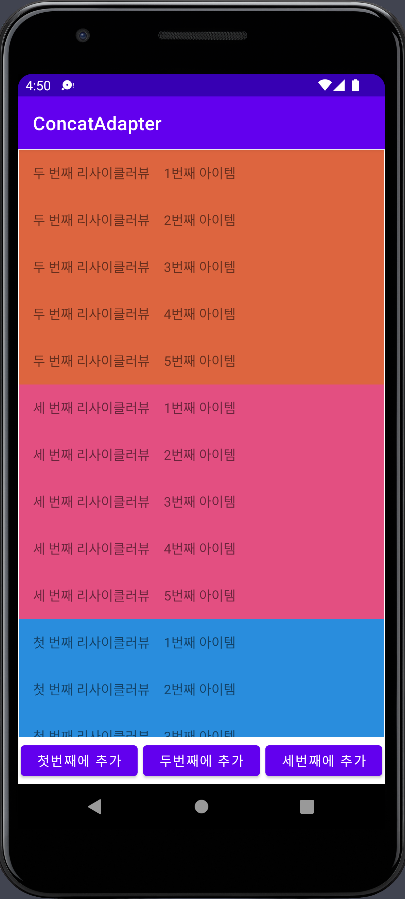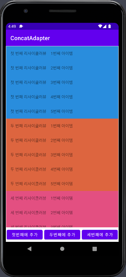 세 개의 어답터가 순차적으로 나타나고 아이템이 추가되는 것도 잘 동작하는 것을 볼 수 있습니다!