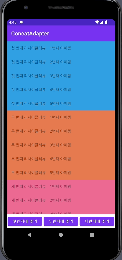 첫 번째, 두 번째, 세 번째 어답터를 순차적으로 넣어주었기 때문에 첫 번째, 두 번째, 세 번째 리사이클러뷰로 순차적으로 나타나는 것을 볼 수 있습니다.