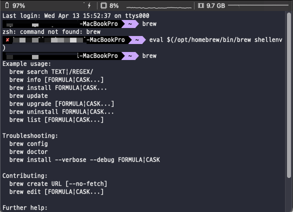 터미널 창의 위의 코드를 입력하여 주면 brew 명령어가 다시 사용 가능하게 됩니다.