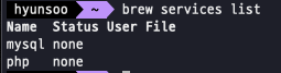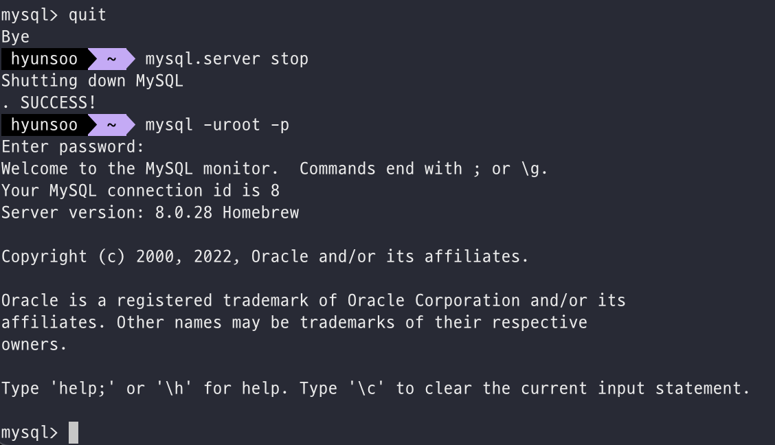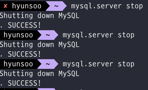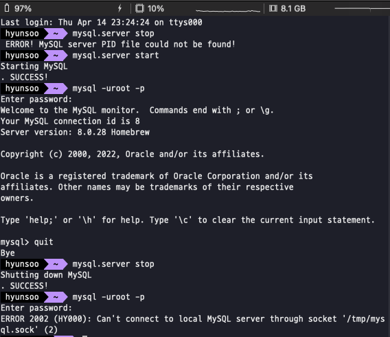 위에 사진을 보면 첫 번째 사진은 mysql 서버를 종료하는 mysql.server stop 명령어를 사용하여 서버를 종료하였는데도 계속 명령어가 동작하는 모습입니다. 두 번째 사진은 서버가 종료되었다는 창이 나왔지만 여전히 로그인이 되는 오류였습니다.