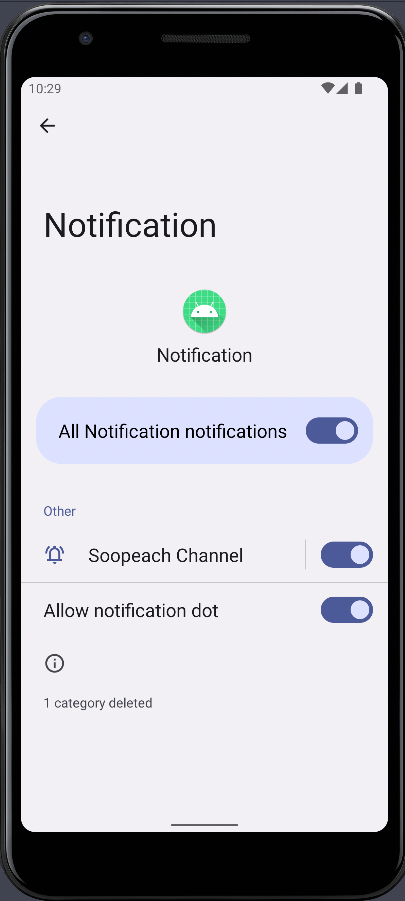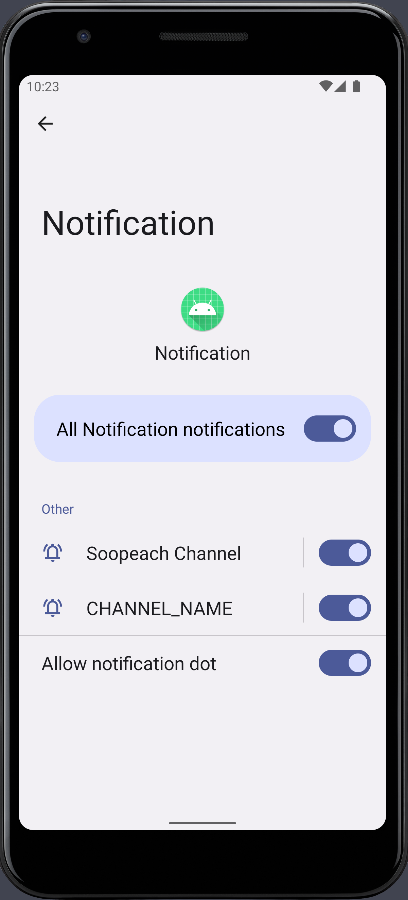 이런식으로 채널을 확인할 수 있습니다. 채널이 두개가 등록되어있는 것을 볼 수 있습니다. 아래의 CHANNEL_NAME이라는 이름을 가진 채널은 글을 쓰기전 테스트 하는 과정에서 NotificationChannel 객체를 생성할 때 CHANNEL_NAME ="soopeach Channel"의 CHANNEL_NAME을 넣은 것이 아니라 문자열로 "CHANNEL_NAME"을 넣어 잘못생성이된 채널입니다.