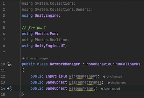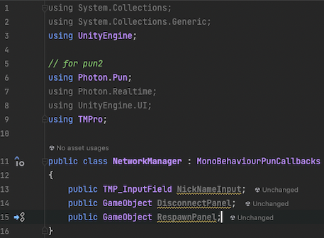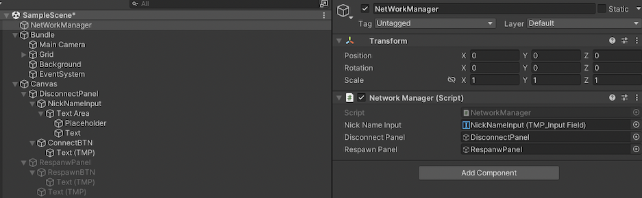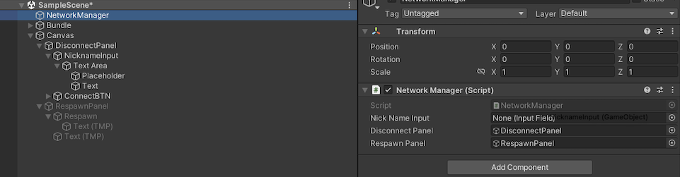 스크립트를 작성후 NetworkManager 오브젝트에 NetworkManager 스크립트를 넣어준 후 public으로 선언된 NickNameInput, DisconnectPanel, RespawnPanel 을 초기화 시켜주는 과정에서 문제가 발생하였습니다.