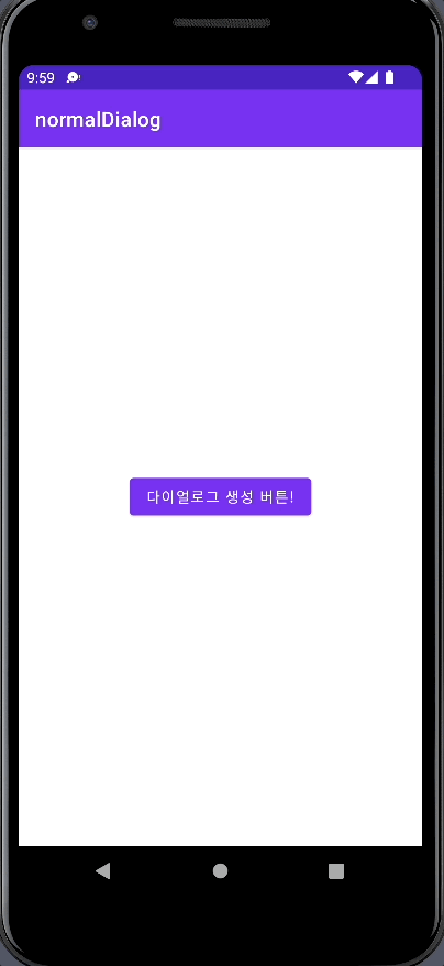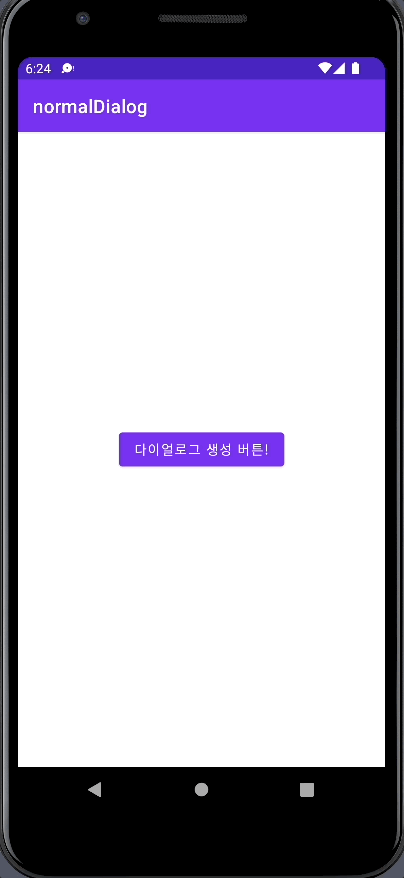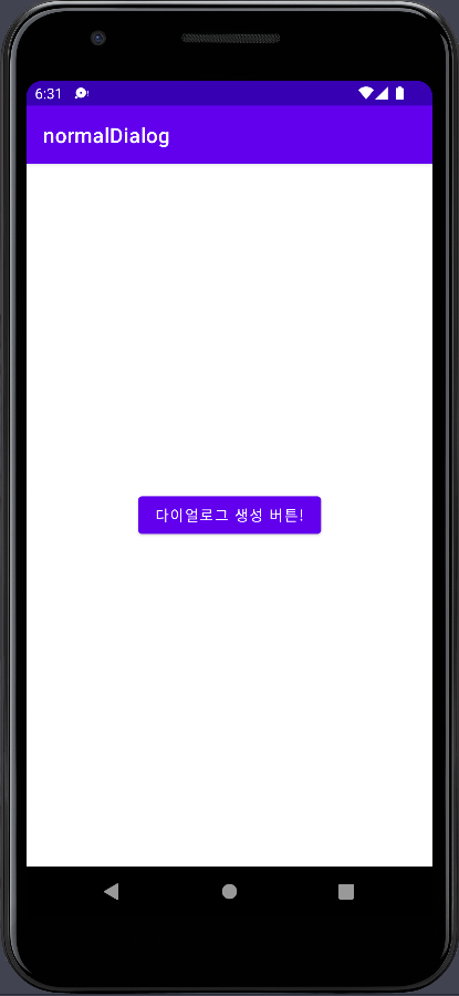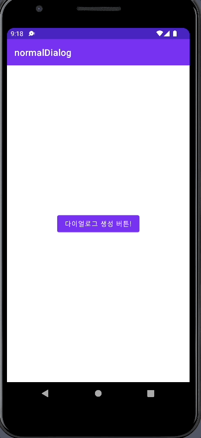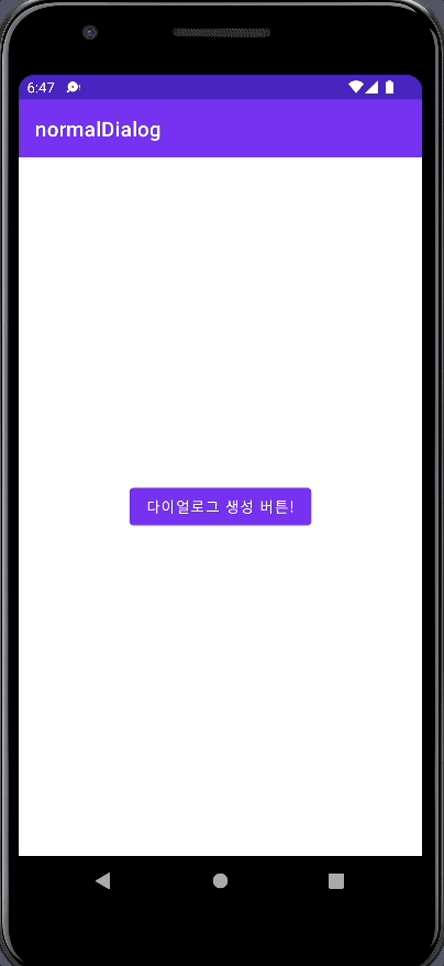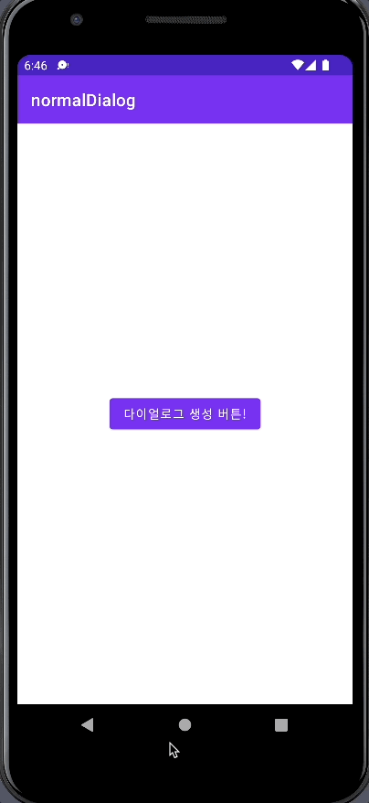 메인 엑티비티는 이렇게 구성되어있습니다. basicDialog()라는 AlertDialog.Builder를 반환하는 함수를 만들고 btn아이디를 가진 버튼(다이얼로그 생성 버튼!)이 클릭된다면 반환된 AlertDialog.Buider를 show()하여 화면에 띄우도록 만들었습니다.