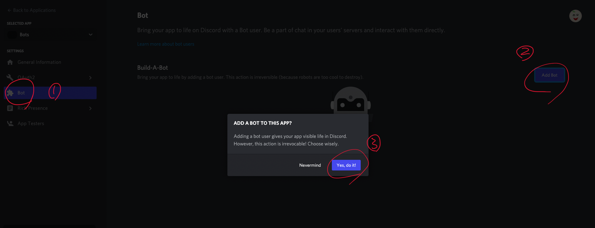 어플리케이션을 생성하고 들어가보면 위와 같은 화면을 볼 수 있는데 좌측 메뉴바에서 Bot으로 들어가 봇을 생성해줍니다.
