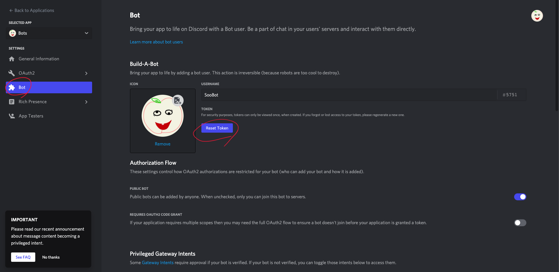 처음 디스코드 봇(어플리케이션 및 봇)을 생성한 링크로 이동하여 어플리케이션 - 봇으로 접속하여줍니다.