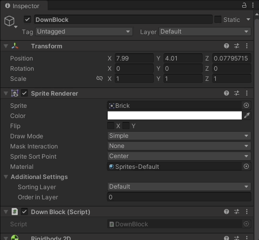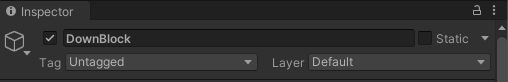 플레이어가 아래로 지나간다면 블럭이 추락하여 플레이어를 공격하는 오브젝트입니다. 위 움짤에서 보이듯이 기본적인 스테이지의 바닥(map)과 추락하는 블럭(DownBlock)이 충돌판정이 일어나 스테이지의 바닥과 추락하는 블럭이 맞붙어있는 것을 볼 수 있습니다. 스테이지 바닥의 레이어는 Map으로 되어있고 추락하는 블럭의 레이어는 건들지 않았으므로 Default로 설정 되어있습니다.