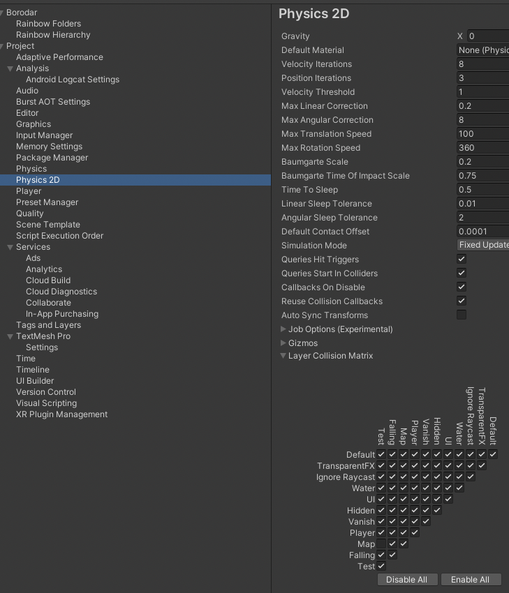 스테이지 바닥(Map레이어)와 추락하는 블럭(Test레이어)간의 충돌판정을 무시할 것이기 때문에 Physics(2D)메뉴의 Layer Collision Matrix항목으로 와서 Test와 Map 사이의 체크박스를 해제하였습니다. 이제 Test레이어와 Map레이어 간에는 충돌판정이 일어나지 않을 것 입니다.