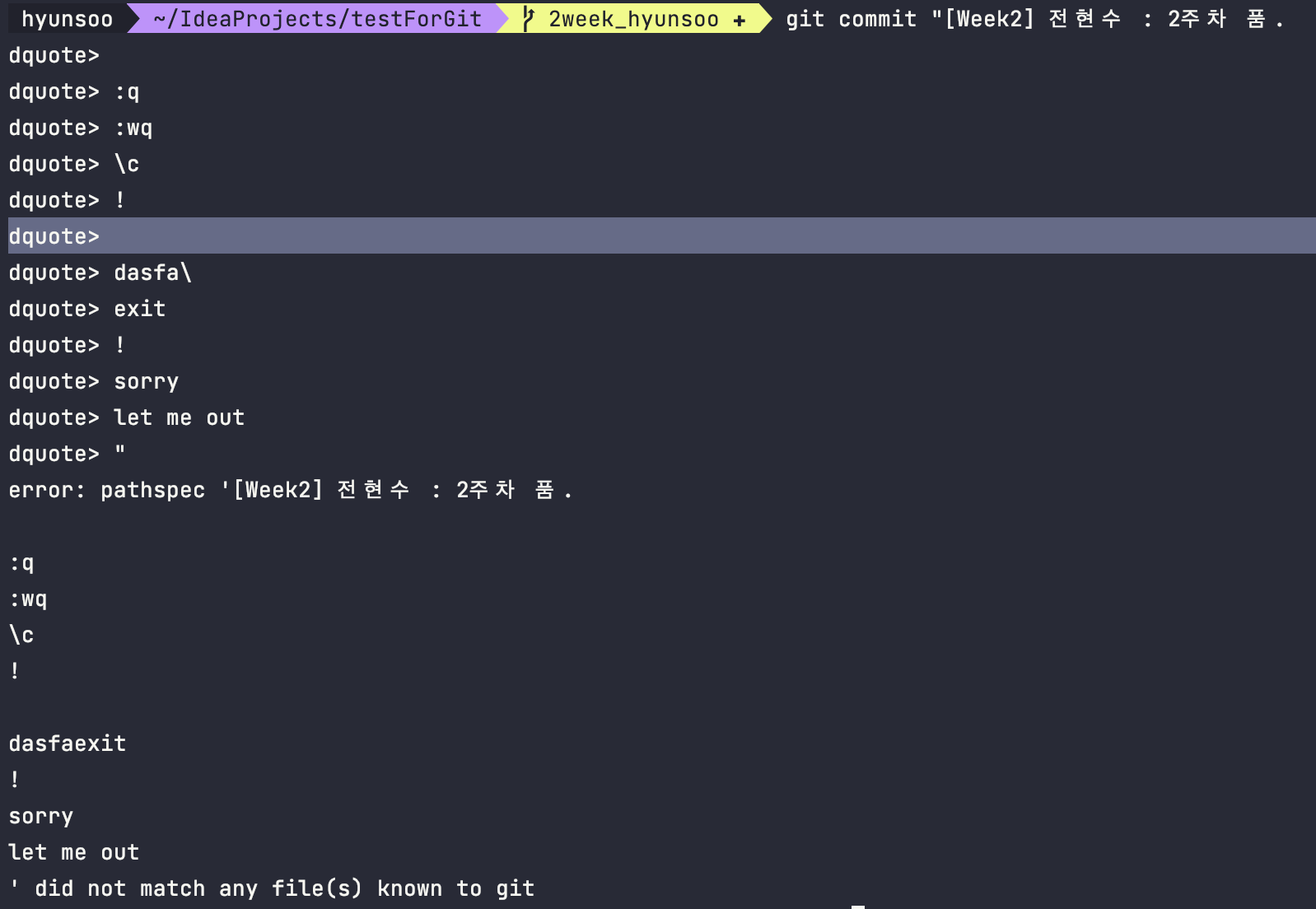요런식으로 무한 지옥에 빠졌었다... 처음 저 오류가 발생하였을 땐 정말 당황했다.. 아는 명령어도 별로 없지만 나름 아는 명령어들을 다 써보았는데 탈출이 불가능했다.