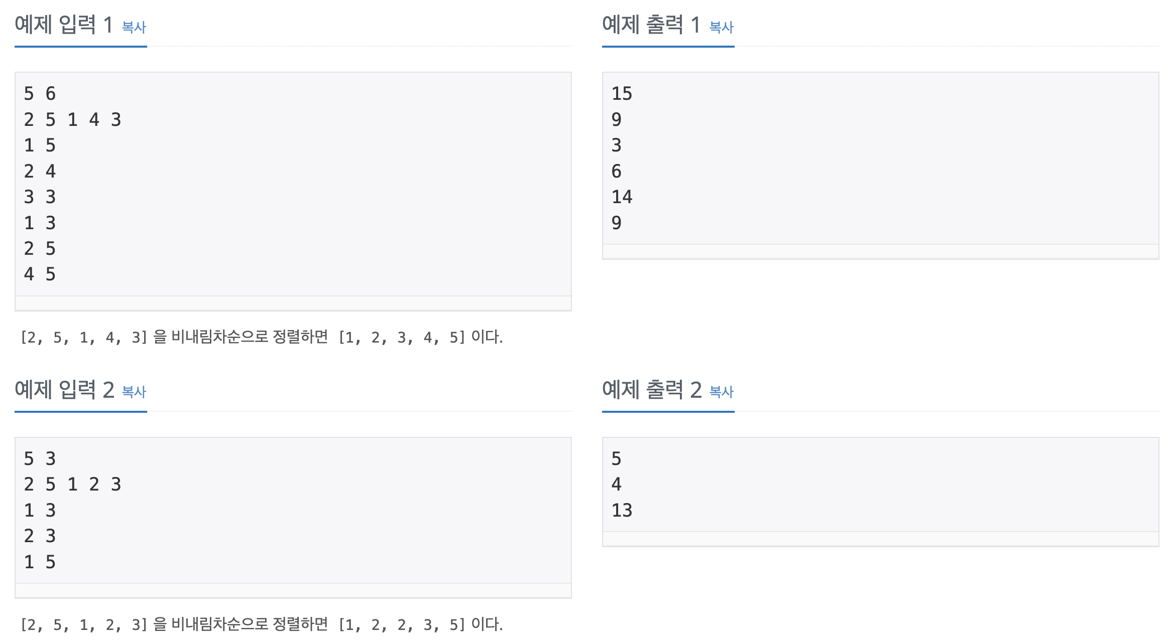 질문은 1 5와 같은 형식인데 A를 비내림차순으로 정리하고(B라는 배열이라고 가정) 거기서 1번째 ~ 5번째까지 원소의 합을 구하는 것입니다.(인덱스 [1]~ [5]가 아님!!!)