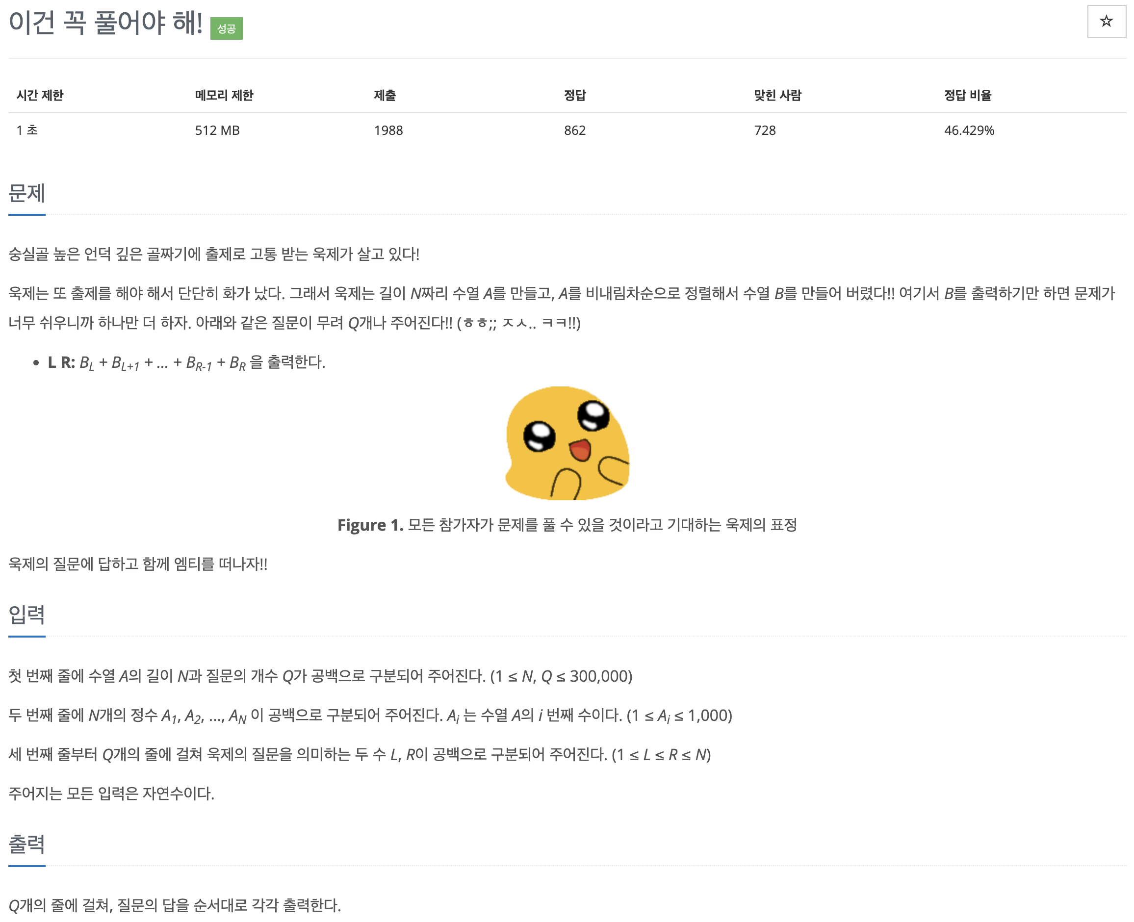 예제 아래에서 힌트를 볼 수 있는데 힌트에서 설명한 대로 질문이 들어올 때마다 반복문을 통해 반복문을 통해 B라는 배열을 탐색하여 범위의 합을 구한다면 시간 초과 오류가 발생합니다.