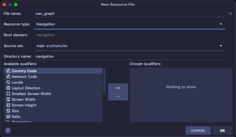 app -> res -> New -> Android Resource File 경로에서 새 파일을 생성합니다.