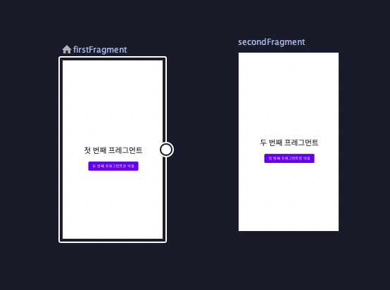 해당 프레그먼트 부분에 마우스를 올리면 위의 사진과 같이 동그란 점이 나오는데 이 점이 시작하는 지점이 출발 프레그먼트, 이 점이 끝나는 곳이 도착 프레그먼트입니다. 첫 번째 -> 두 번째 이동과 두 번째 -> 첫 번째 이동을 모두 구현하고 싶기 때문에 firstFragment에서 secondFragment로, 그 반대로도 점을 이어줍니다.