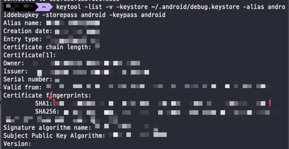- keytool -list -v -keystore ~/.android/debug.keystore -alias androiddebugkey -storepass android -keypass android
