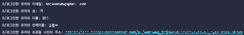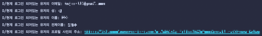 handleSignInResult 함수는 구글로그인한 유저의 account정보를 받아와 로그창에 정보들을 출력하도록 구현하였습니다. GoogleSignInOptions에서 requireEmail()과 같은 식으로 요청한 정보들만 사용이 가능합니다. 위에서 requireEmail()로 email을 requireProfile()로 familyName, givenName, displayName, photoUrl을 요청하였습니다.