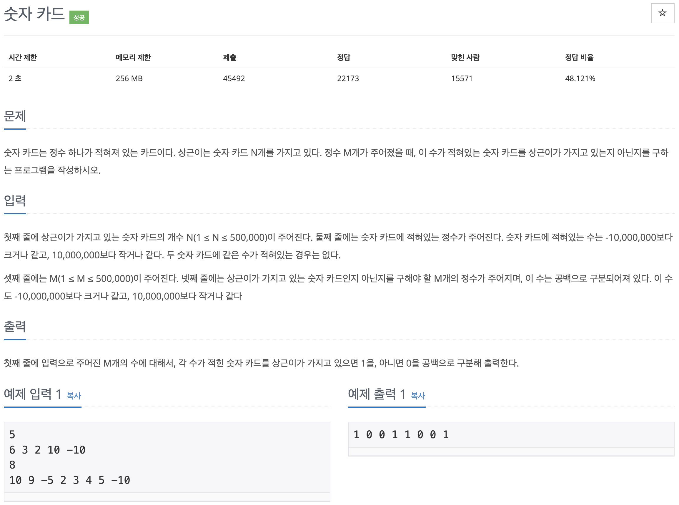 백준 10815번 문제입니다. (solved.ac) 기준 실버 5 문제입니다.