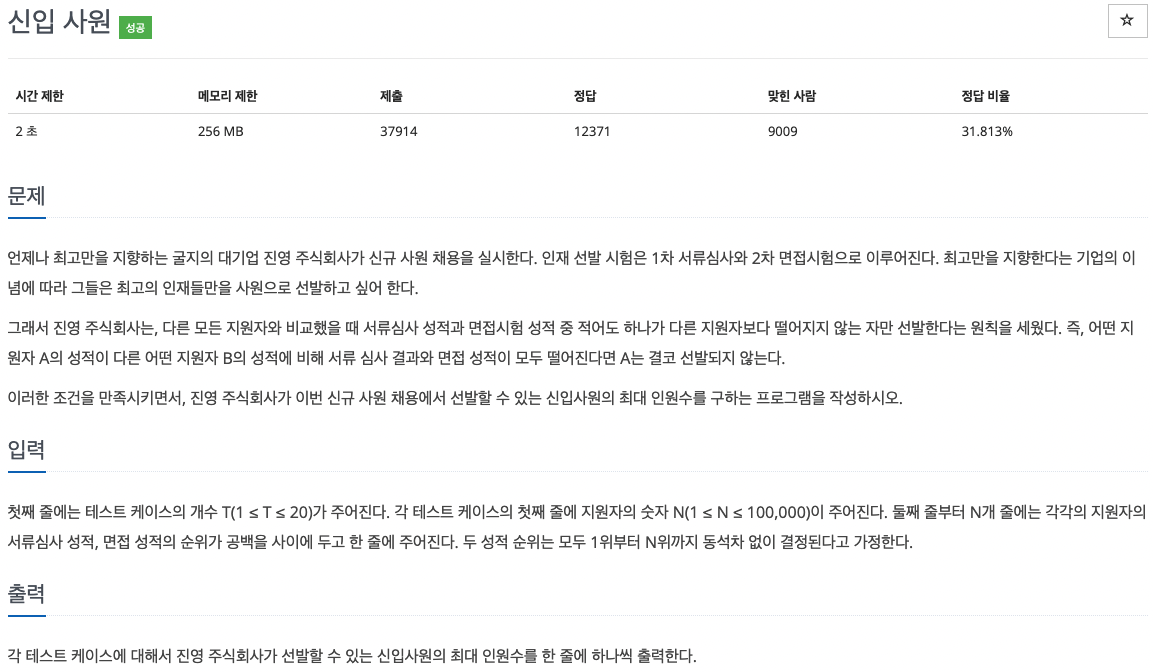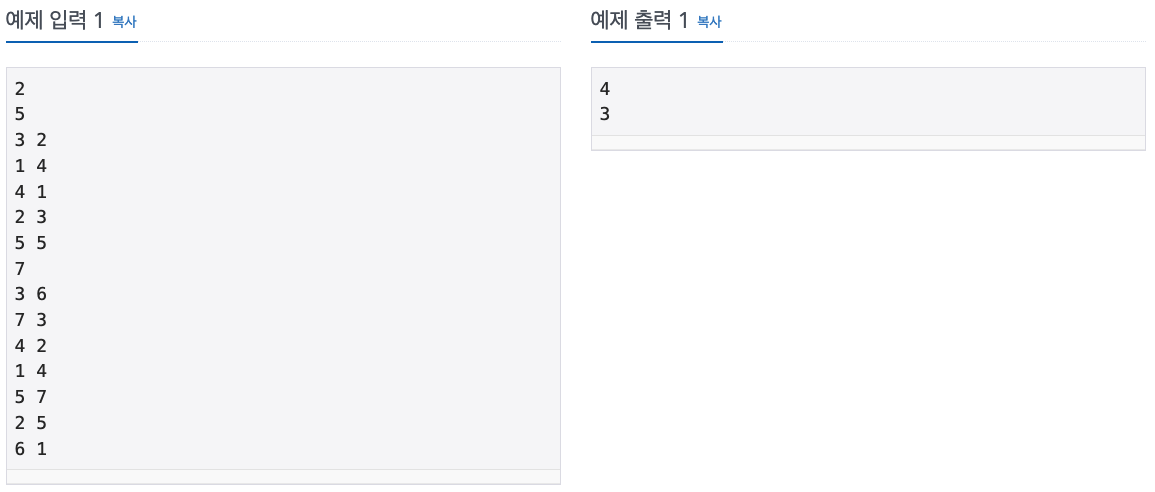 따라서 예제 입력 1번에서 1번 테스트 케이스에서 신입사원이 될 수 있는 최대 인원수는 4명입니다.