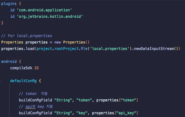 local.properties 사용을 위한 코드를 작성하였다면, android 내부의 defaultConfig에서 local.properties파일에 적어놓은 key, token을 연결시켜주어야 합니다.