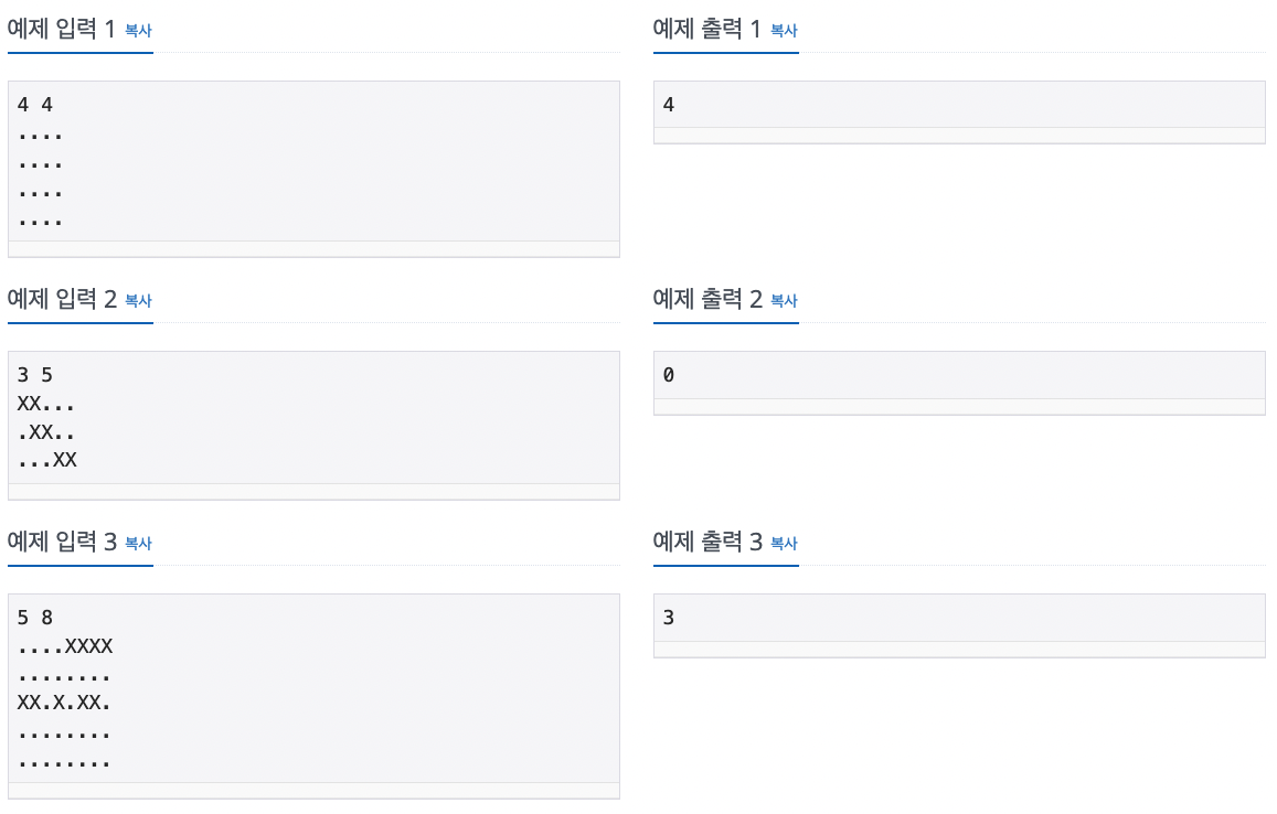 첫째 줄에 성의 세로 크기 N과 가로 크기 M이 주어진다. N과 M은 50보다 작거나 같은 자연수이다. 둘째 줄부터 N개의 줄에는 성의 상태가 주어진다. 성의 상태는 .은 빈칸, X는 경비원이 있는 칸이다