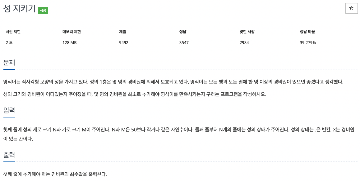 행을 기준으로 탐색했을 때 필요한 경비원의 수와 열을 기준으로 탐색했을 때 필요한 경비원의 수를 구한 후 둘 중 더 작은 값을 출력해주면 됩니다.