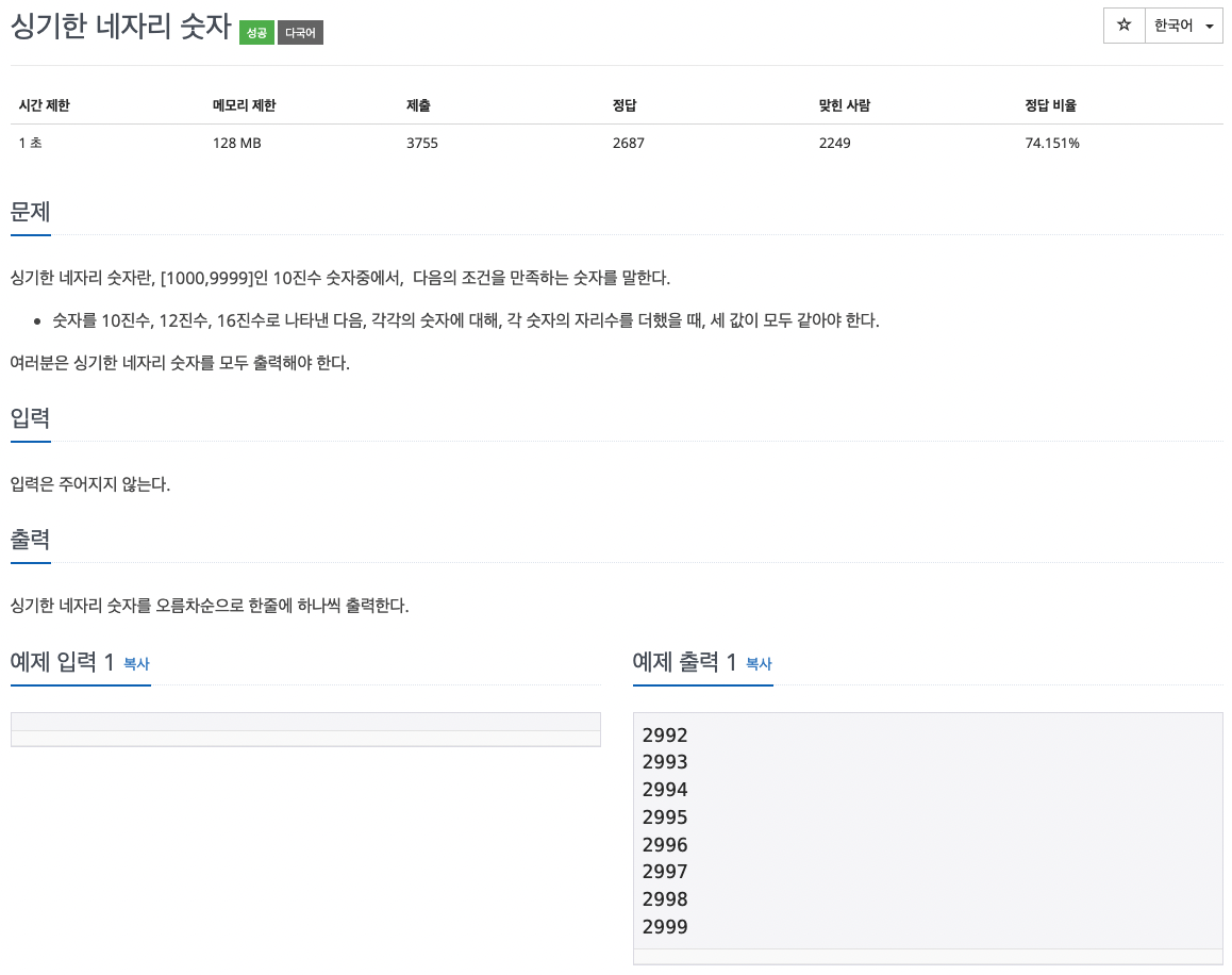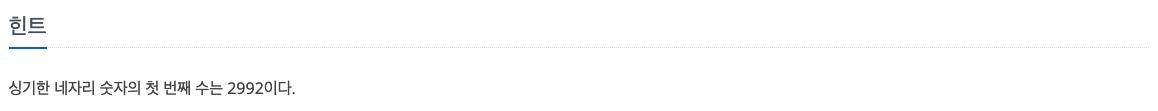 1000 ~ 9999까지의 모든 수들 중 싱기한 네자리 숫자를 출력하면 되는 문제입니다. 힌트에서 싱기한 네자리 숫자의 첫 번째 수는 2992로 알려줬으므로 1,000부터가 아닌 2,992부터 탐색하도록 하였습니다.