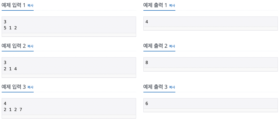 수열 S가 주어졌을 때, 수열 S의 부분 수열의 합으로 나올 수 없는 가장 작은 자연수를 구하는 프로그램을 작성하시오. 예를 들어, S = [5, 1, 2]인 경우에 1, 2, 3(=1+2), 5, 6(=1+5), 7(=2+5), 8(=1+2+5)을 만들