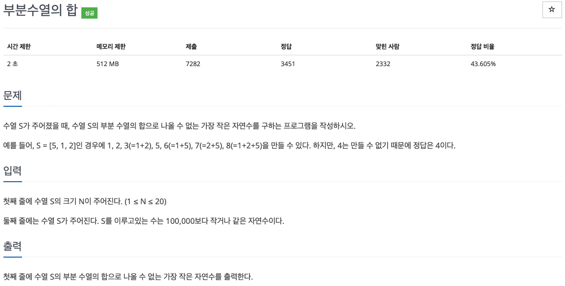 수열 s가 주어지고 이 수열 s의 부분 수열의 합으로 나올 수 없는 가장 작은 자연수를 구하는 문제입니다.