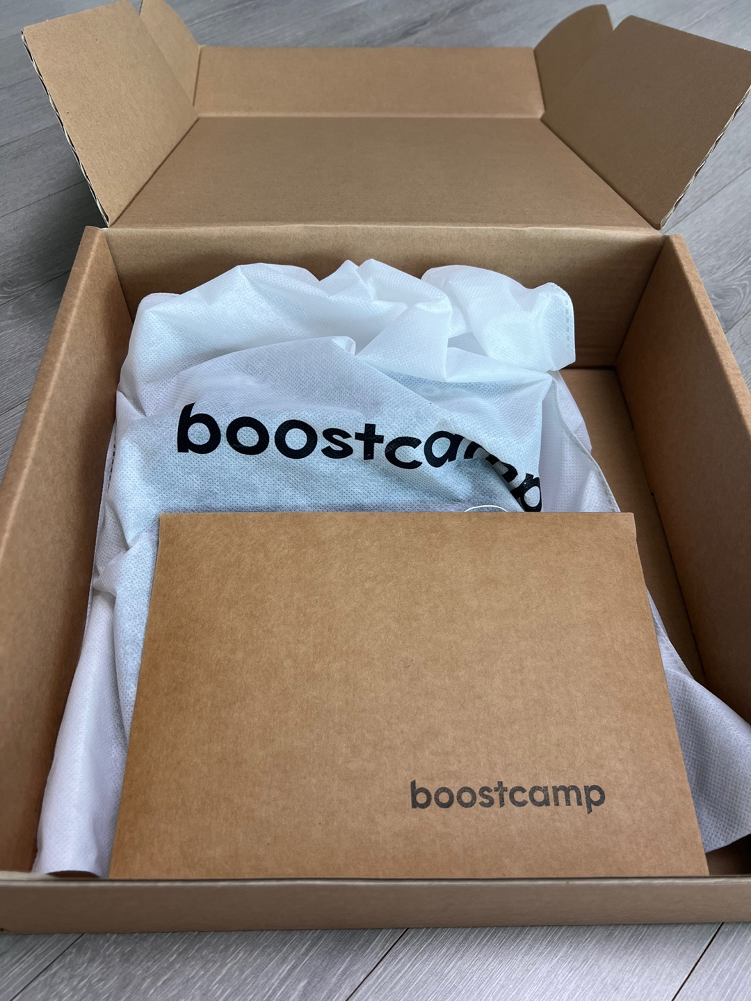 박스 안에 boostcamp띠가 둘러진 박스가 또 있는 상태였구 띠를 빼준 후 상자를 다시 열어보면