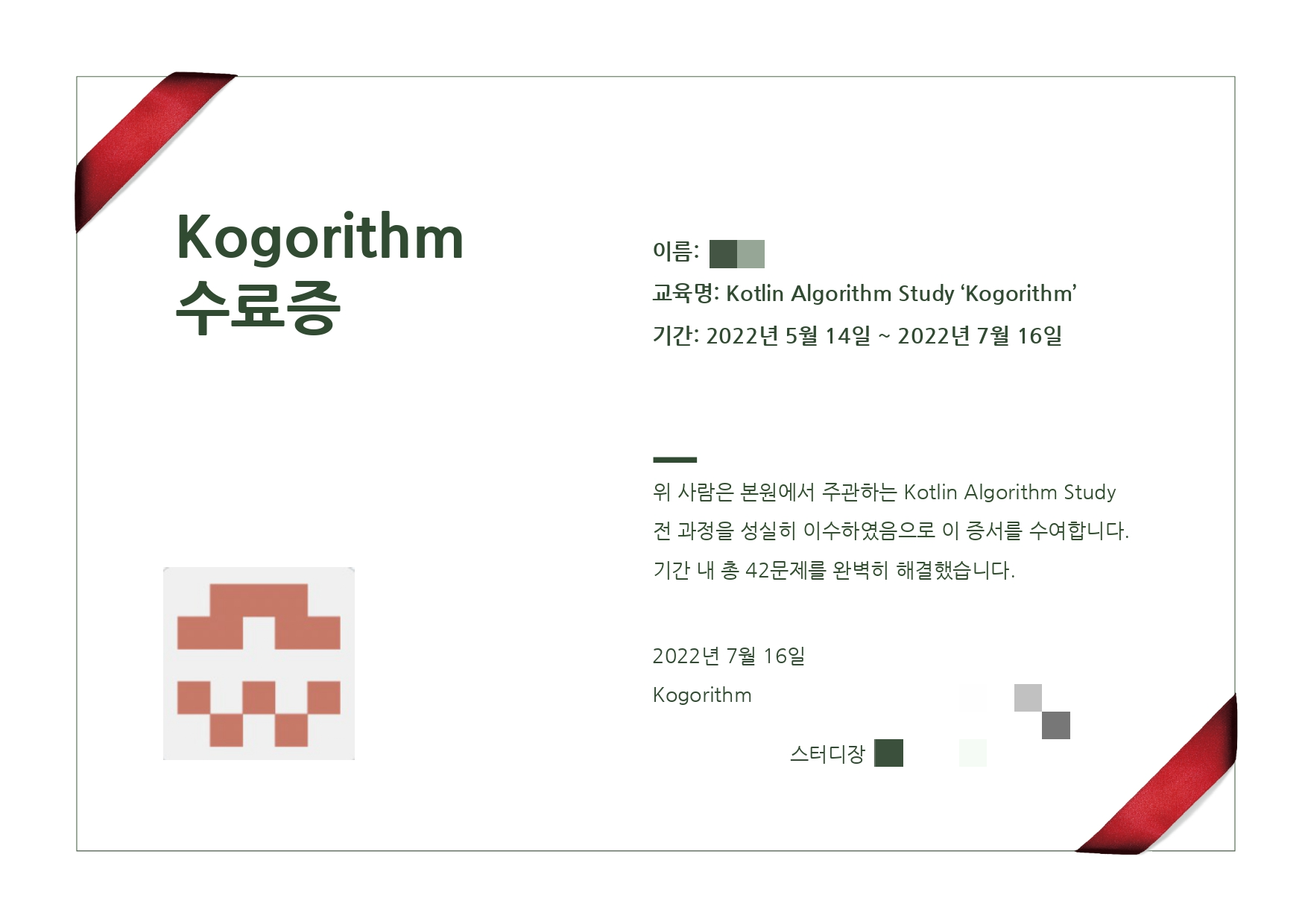 Kogorithm 스터디가 끝나고 스터디장님께서 정말 너무 너무 이쁜 수료증을 만들어주셨다.