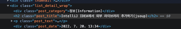 위의 사진에서 보면 블로그의 메인페이지를 기준으로 post_title이라는 클래스를 가진 h2태그 안에 게시글의 제목이 있는 것을 확인할 수 있습니다. 이를 이용하여 메인페이지를 기준으로 게시글의 제목이 있는 부분만 코드를 불러오도록 하겠습니다.