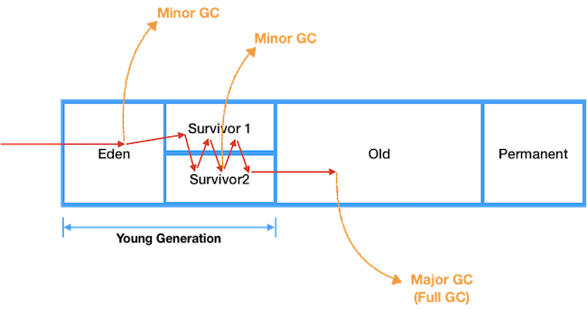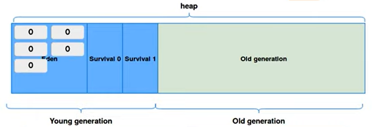 효율적인 GC를 위하여 Heap Area는 위와 같이 Young generation(Eden+Survival)과 Old generation으로 나누어짐