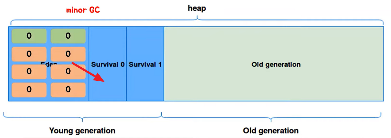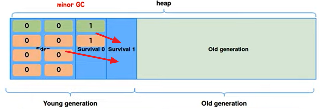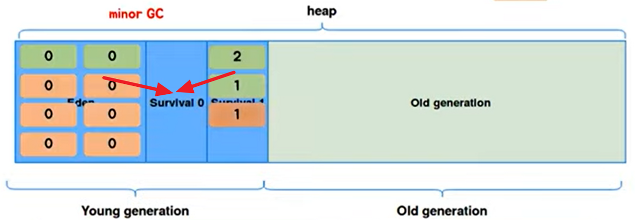 Eden 영역에 객체가 다 쌓이게 되면 Young Generation(Eden+Survival) 영역에 있는 객체들을 참조 정도에 따라 비어있는 Survival인 Survival 1 영역으로 이동 혹은 회수. 살아남아 Survival 1로 이동한 객체들은 age-bit가 1 증가.