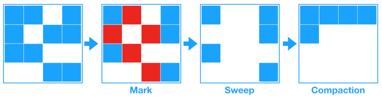 - Compact 과정 : Sweep 후에 분산된 객체들을 Heap의 시작 주소로 모아 메모리가 할당된 부분과 그렇지 않은 부분으로 압축