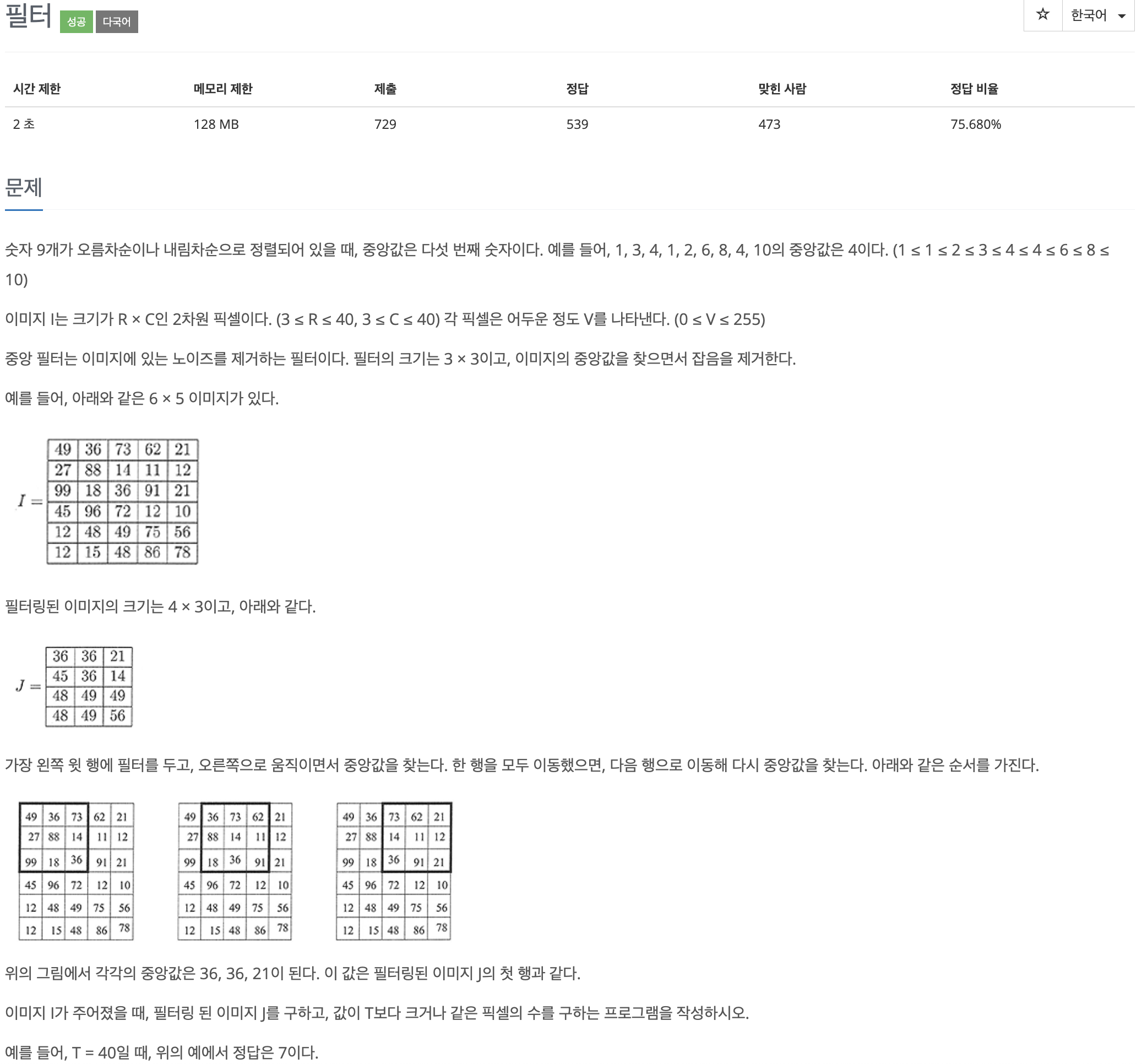 이미지(2차원 배열)를 입력받고 3 * 3필터를 통해 이미지의 중앙값을 찾으면서 필터링한 후 해당 이미지에 T 보다 크거나 같은 픽셀의 수를 구하는 문제입니다. 3 * 3 필터를 사용하면 9개의 숫자를 확인할 수 있는데 9개의 수들 중 5번째 숫자가 중앙값입니다.