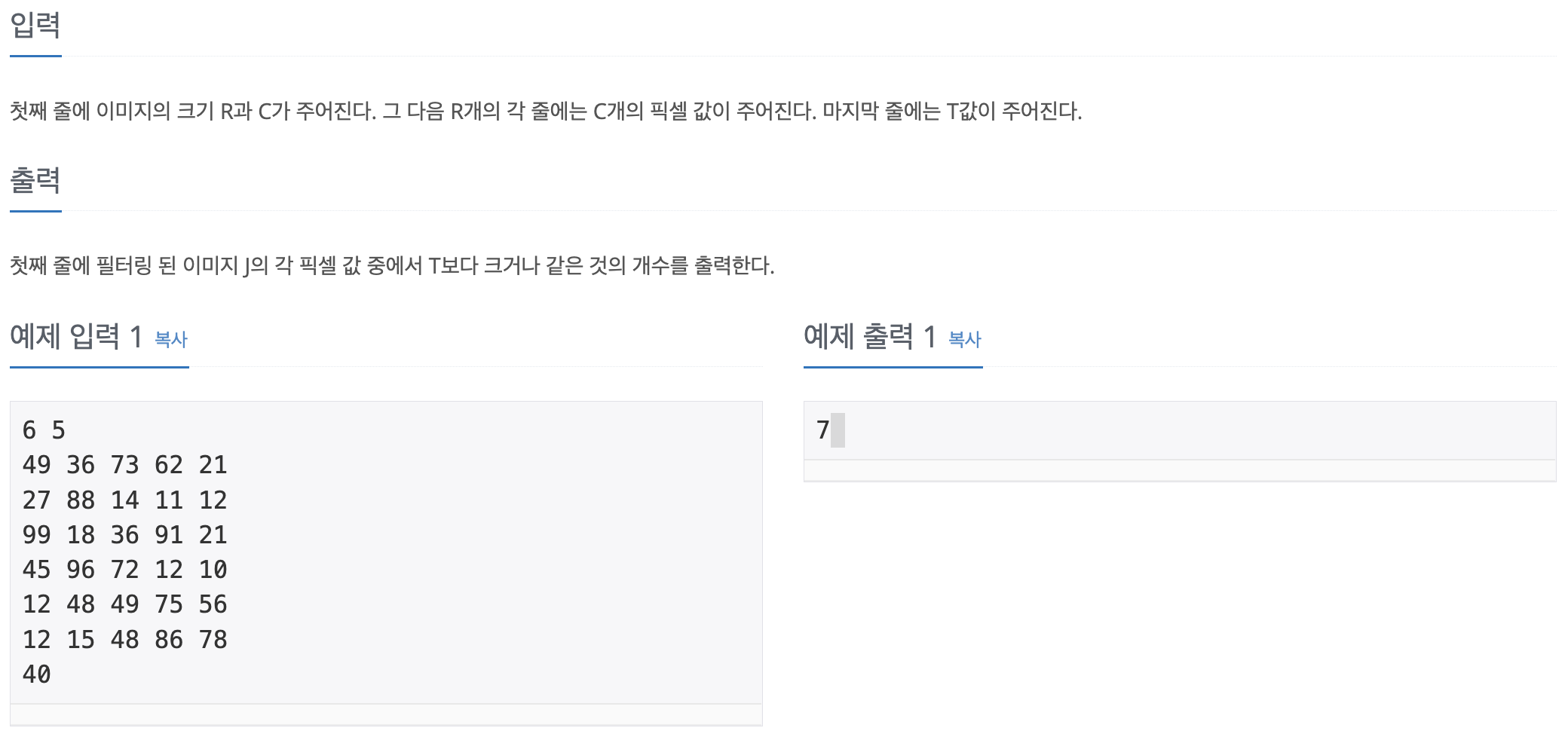 이미지를 3 * 3으로 완전탐색한 후 중앙값들을 찾아서(필터링) T보다 크거나 같은 수들을 구하는 방식으로 문제를 해결하였습니다.