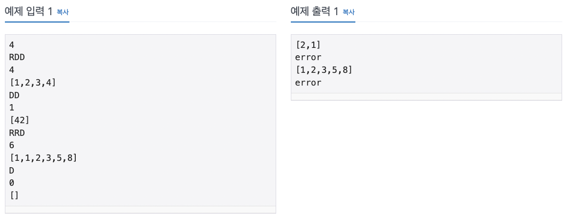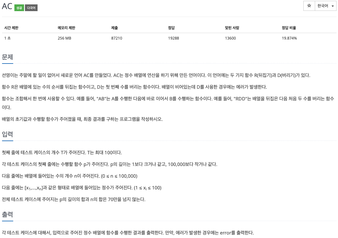 백준 5430번 문제입니다. (solved.ac) 기준 골드 5 문제입니다.