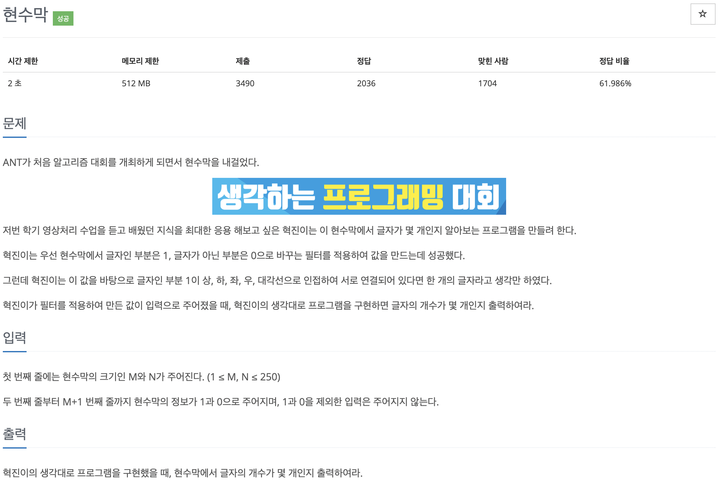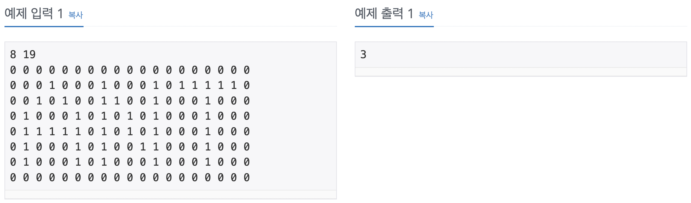 2차원 배열로 0, 1을 입력받고 글자의 개수를 출력하는 문제입니다. 글자인 부분은 1, 글자가 아닌 부분은 0이라고 합니다.