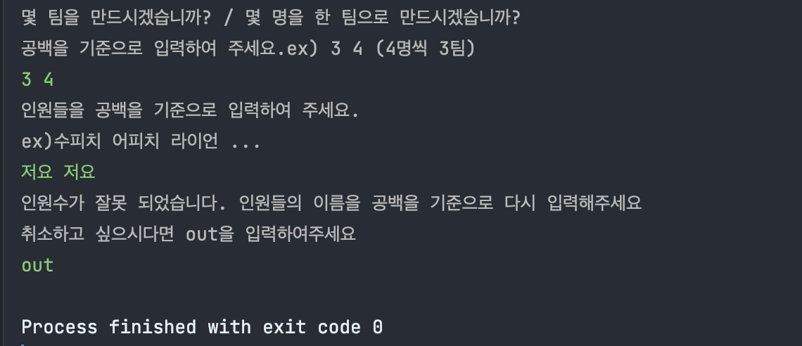 name = list(input("인원수가 잘못 되었습니다. 인원들의 이름을 공백을 기준으로 다시 입력해주세요\n취소하고 싶으시다면 out을 입력하여주세요\n").split())