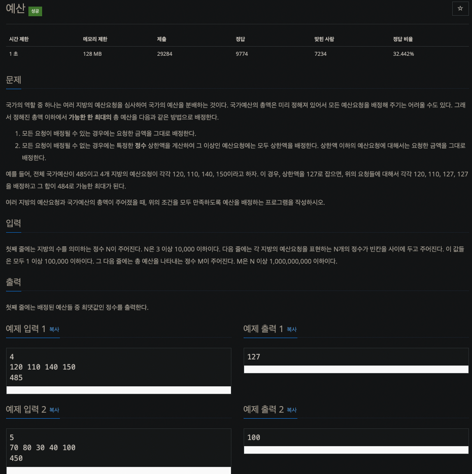 백준 2512번 문제입니다. (solved.ac)기준 실버 3 문제입니다.
