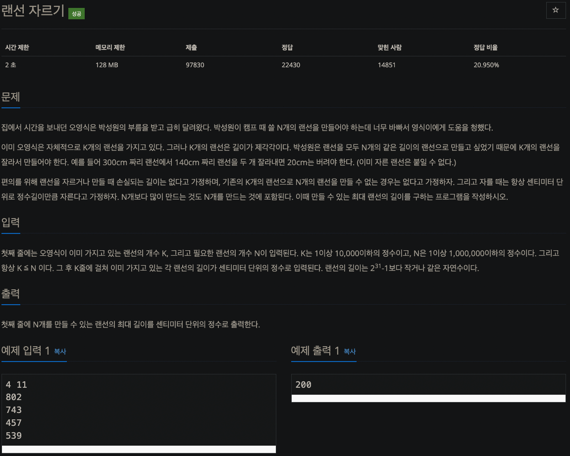 백준 1654번 랜선 자르기 문제입니다. (solved.ac)기준 실버 3 문제입니다.