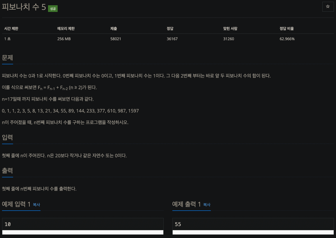0 혹은 자연수인 n을 입력받아 n번째 피보나치 수를 출력하는 문제입니다. n번째 피보나치 수는 n-1 번째 피보나치 수 + n-2번째 피보나치 수 입니다.