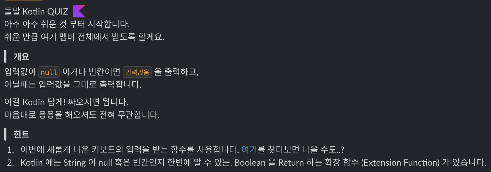 2번 힌트에 나와있는 String 이 null 혹은 빈칸인지 한번에 알 수 있는, Booleandmf Return하는 확장 함수는 isNullOrBlank() 입니다.