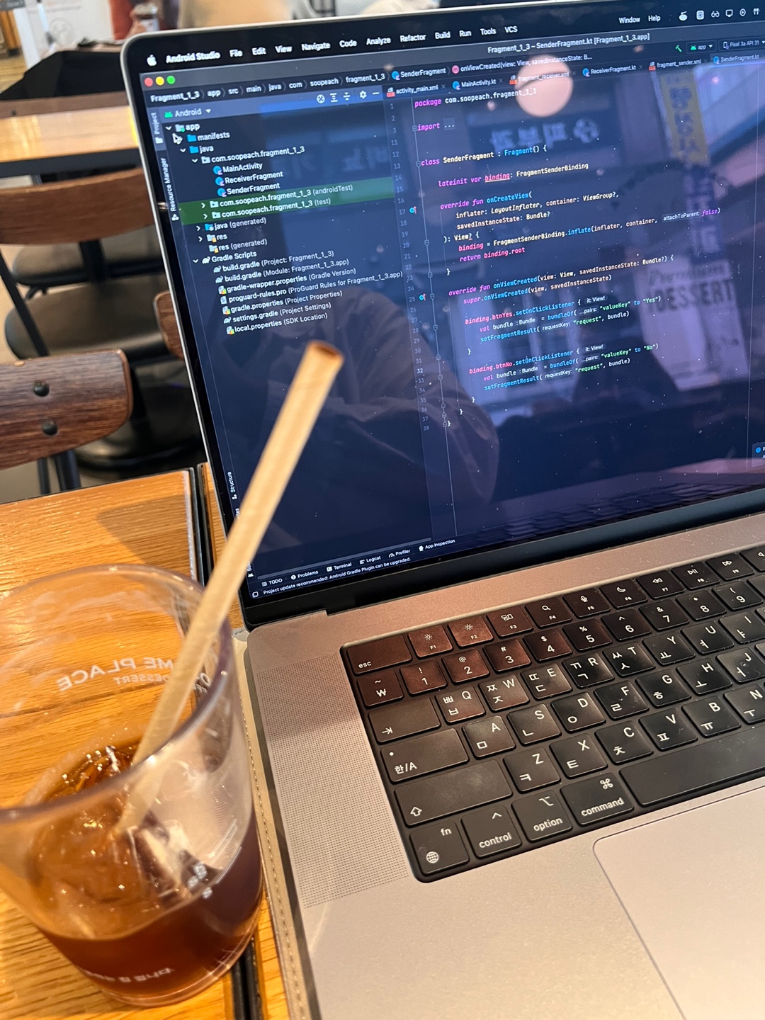 얼마전 아메리카노를 먹였던 맥북과.... 오늘 알고리즘 스터디가 파토나서 이제 입문하기 시작한 안드로이드 공부중입니다.