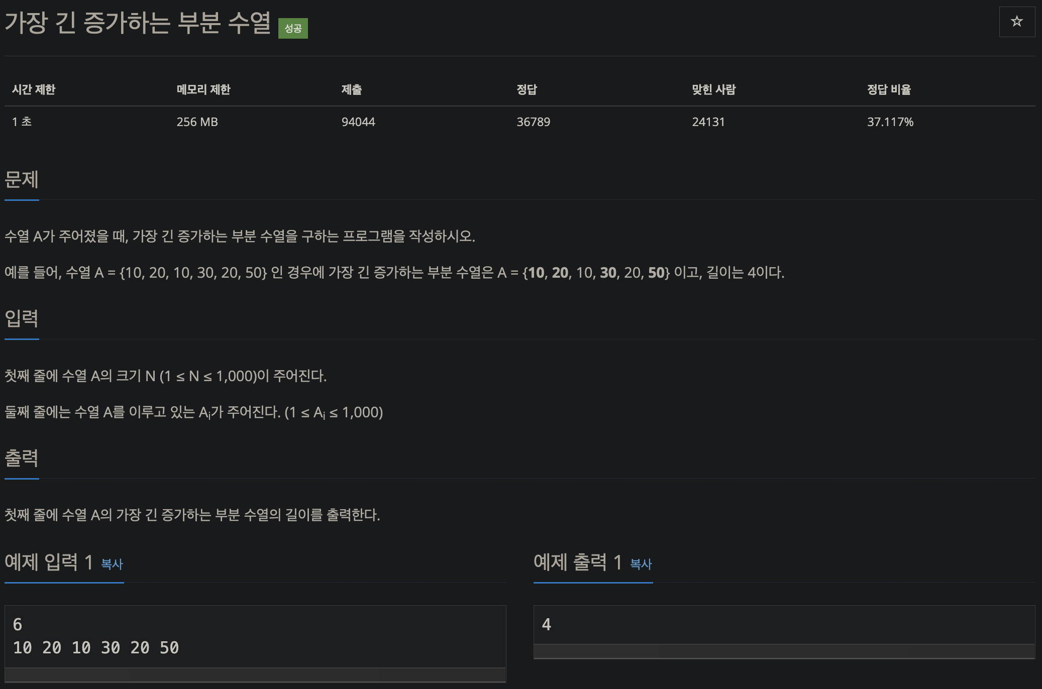 예제 입력 1의 최장 증가 수열(LIS)은 [10, 20, 30, 50]이며 길이는 4입니다.