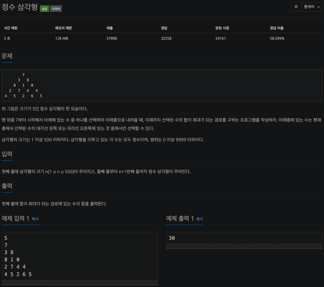 백준 1932번 문제입니다. (solved.ac)기준 실버 1 문제입니다.