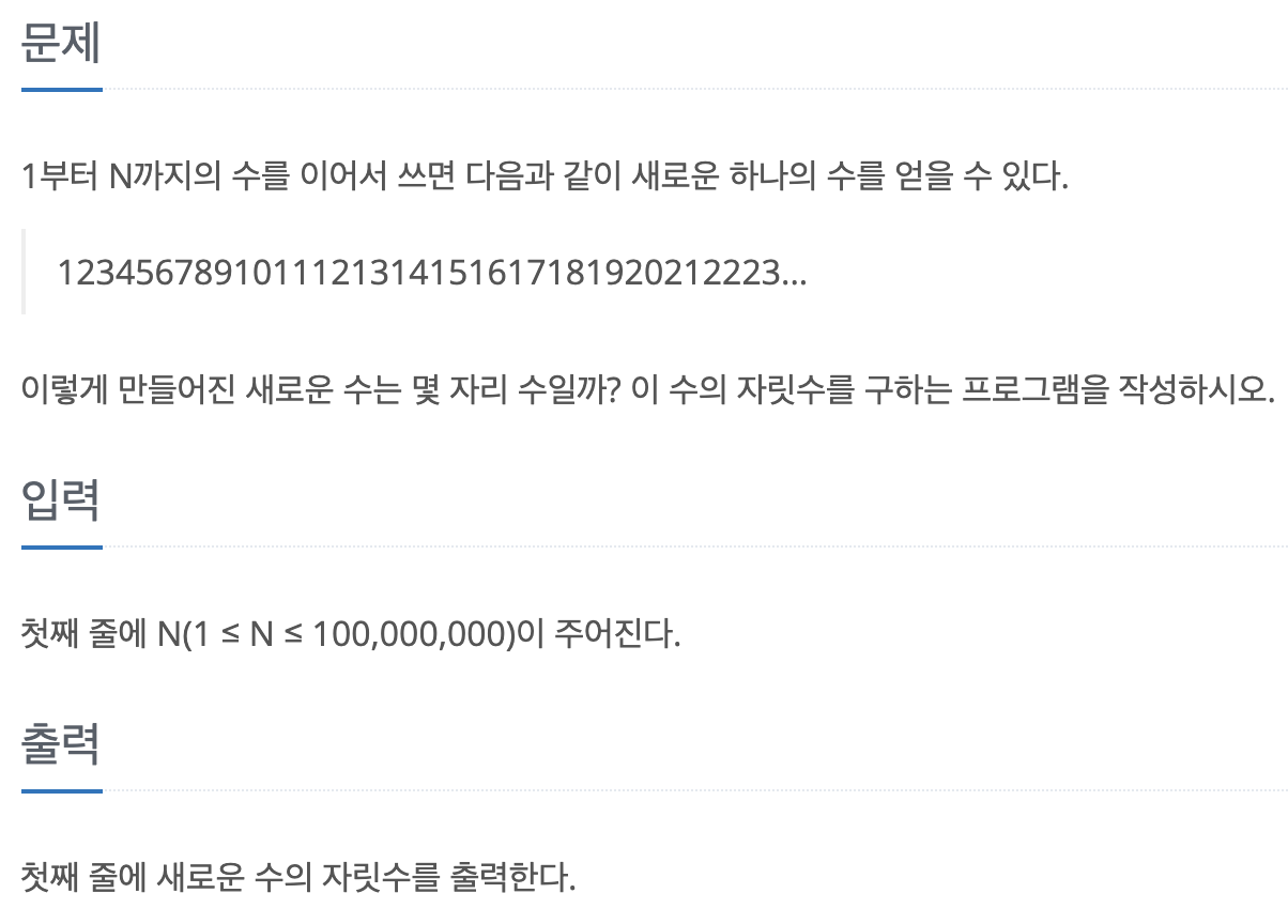 백준 1748번문제입니다. (solved.ac) 기준 실버 3문제입니다.