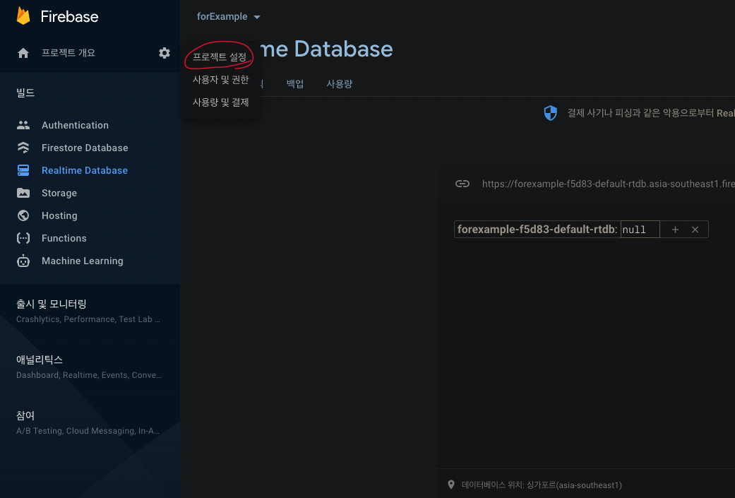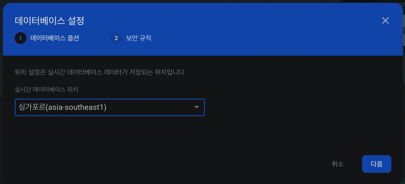 저는 실시간 데이터베이스 위치를 우리나라에서 가까운 싱가포르로 정해주었습니다. 다음 버튼을 눌러줍니다.