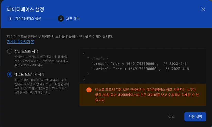 테스트 모드에서 시작은 설정일로부터 30일간 접속하는 모든 사용자가 데이터를 읽고 쓸 수 있기 때문에 실제 서비스를 하게 된다면 사용하면 안 됩니다.