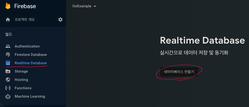 앱을 실행시킨 후 다시 파이어 베이스 홈페이지로 돌아가서 빌드 - Realtime Database에 들어가 줍니다.