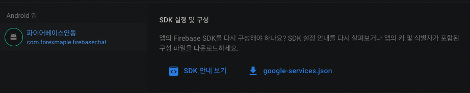 아래로 내려가 보면 내 앱 카테고리에서 SDK 설정 및 구성에 있는 google-services.json을 다운로드하고 파이어 베이스와 프로젝트를 연동했을 때와 같은 경로인 project - app 경로로 덮어씌워줍니다(OverWrite). (잘 모르시겠다면 이 글 가장 상단의 링크에 설명되어 있습니다.)